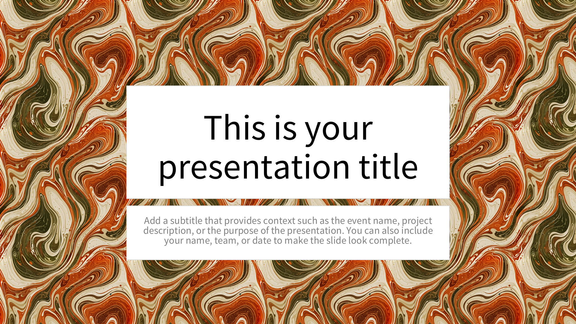 A vibrant blend of swirling, earthy tones, this abstract marbling pattern captures attention with its dynamic and organic flow. The warm hues of orange and multicolor create a mesmerizing dance, perfect for presentations that embrace creativity and innovation. Ideal for artists, designers, or anyone looking to add a touch of nature-inspired elegance to their slides. The swirled patterns offer a subtle yet engaging backdrop, ensuring your content stands out without distraction. This background is available in PowerPoint and image formats, ensuring clarity and impact from every seat in the room.