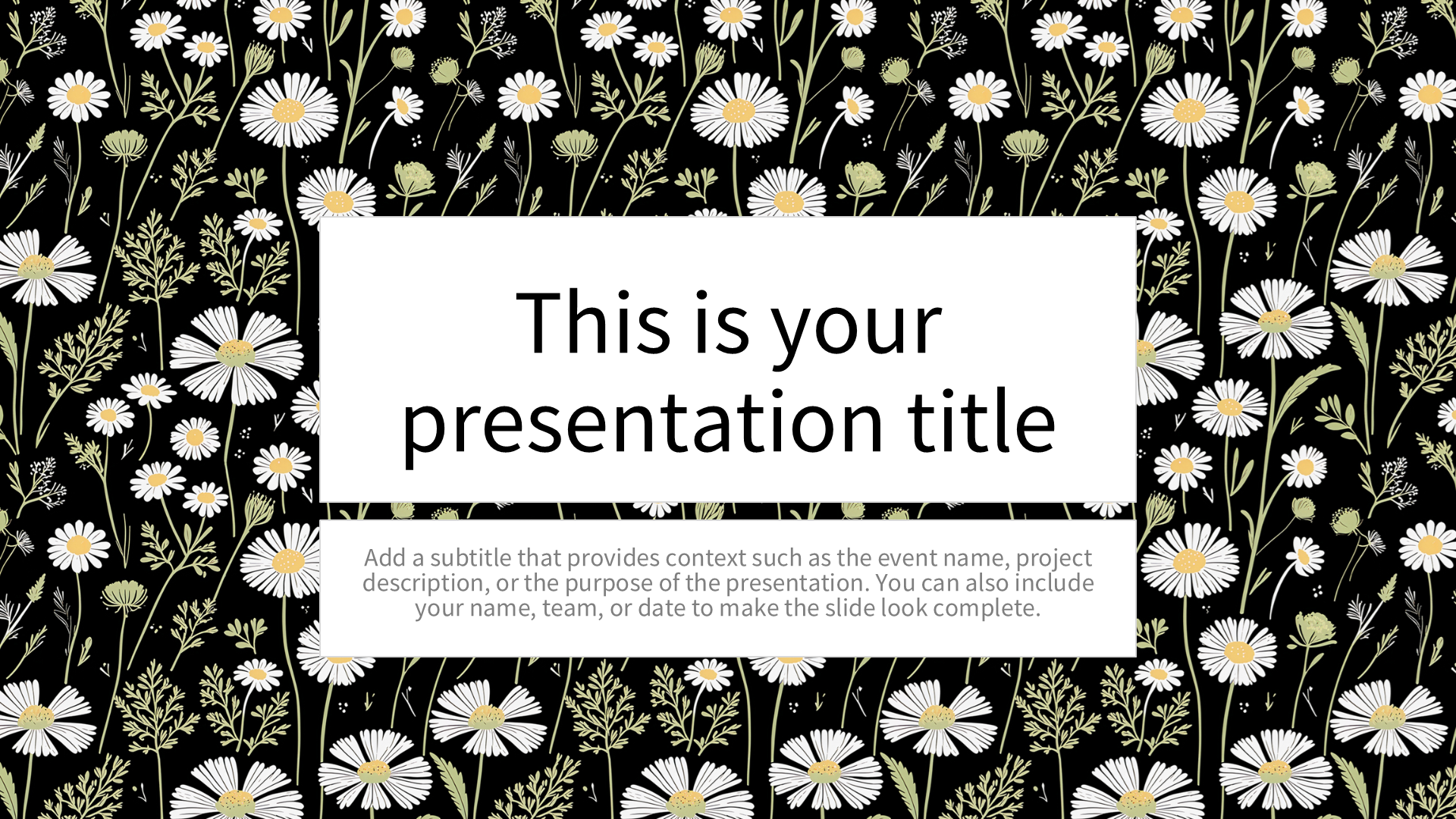 This vintage floral pattern offers a rich tapestry of multicolor blossoms on a black canvas, creating a striking backdrop that enhances clarity and focus. The delicate white flowers, reminiscent of a cottage garden, bring a touch of nostalgia and elegance to your slides, making it perfect for storytelling or presentations with a creative flair. Designed to complement your content effortlessly, this background provides a balance between style and readability. Whether you're presenting a design portfolio or a historical overview, your message will shine through. Available in PowerPoint and image formats, it ensures your presentation leaves a lasting impression.