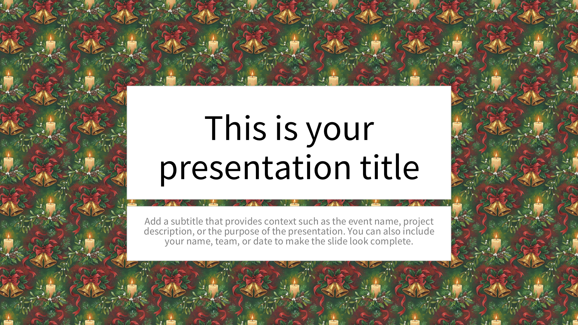With its vibrant red-green-gold palette, this festive pattern is a nod to the joyous Christmas spirit, making it perfect for seasonal presentations. The repeating motif of wreaths adorned with bells creates a lively backdrop that supports content without overshadowing it, making it ideal for holiday gatherings, company Christmas parties, or festive event planning sessions. The rich colors and playful design add a touch of warmth and cheer, ensuring your slides capture the holiday vibe from start to finish. Ready in PowerPoint and image formats, it keeps presentations cohesive and engaging from start to finish.